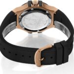 Rose gold-tone stainless steel case with a black rubber strap. Fixed black stainless steel bezel. Black dial with luminous rose gold-tone dauphine-style shape hands and Arabic numeral (12 / 24) hour markers. Dial Type: Analog. Luminescent hands and markers. Date display above the 6 o’clock position. Hattori Calibre VJ42 quartz movement. Scratch resistant mineral crystal. Screw down crown. Solid case back. Round case shape, case size: 42 mm, case thickness: 12 mm. Band width: 24 mm. Tang clasp. Water resistant at 100 meters / 330 feet. Functions: date, hour, minute, second. Potenza Series. Sport watch style.