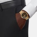 Bold and modern, the gold-tone case of the Medusa Frame watch is encircled by four subtle Medusa studs. The black dial features Roman numeral indexes framed by a Greca pattern. The striking timepiece can be styled with a contemporary navy leather bracelet or with a foulard boasting the iconic Jungle print.