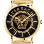 VERSACE WATCH ESSENTIAL 40MM RONDA SWISS QUARTZ 3 HAND MOVEMENT IP CHAMPAGNE ROUND CASE BLACK DIAL MESH METAL BAND , (VEJ400521)