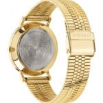This elegant 35mm timepiece features a gold ion-plated stainless steel case and bracelet, adorned with Versace’s signature Greca pattern on both the bezel and bracelet. The black guilloché dial is highlighted by the iconic Medusa head at 12 o’clock, embodying the brand’s distinctive aesthetic. Powered by a Swiss-made quartz movement, the watch ensures precise timekeeping. A sapphire crystal protects the dial, and the watch offers water resistance up to 5 ATM, making it both stylish and functional.